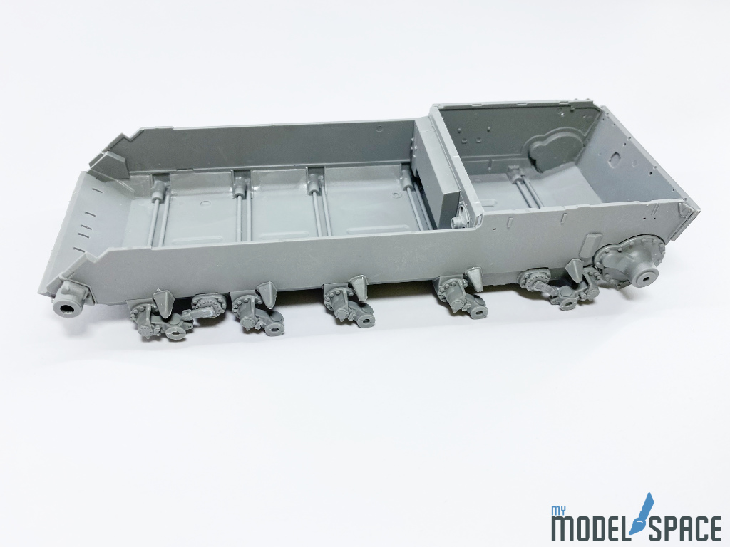 Der Bau eines Miniart Modells ist immer etwas spezielles. Zum einem ist die Detaillierung sehr gut aber meistens durch eine hohe Teileanzahl umgesetzt. Begonnen wird mit der Wanne und dem Fahrwerk. Wenn mit dem Kleber sehr sparsam umgegangen wird, dann kann das Fahrwerk funktionsfähig gestalten werden. Dies ist mir so einigermassen gelungen und wird aber nach der Anpassung an das Diorama sicher festgeklebt, da es einfach stabiler wird.