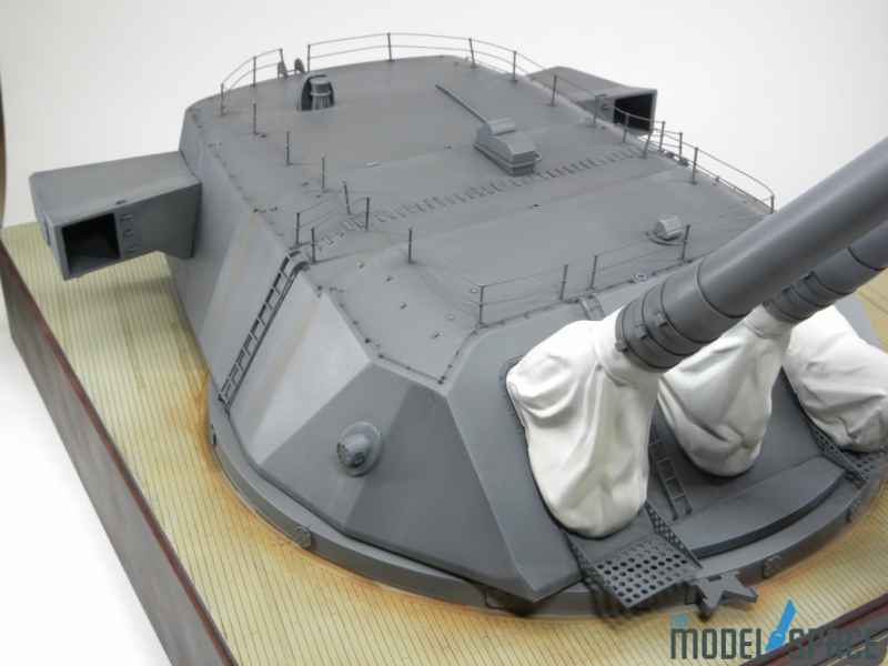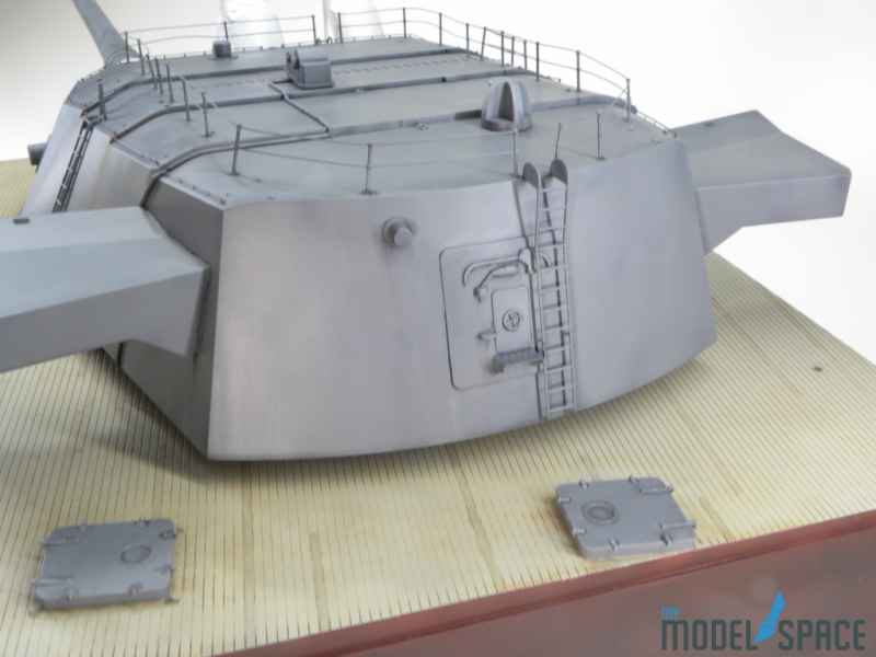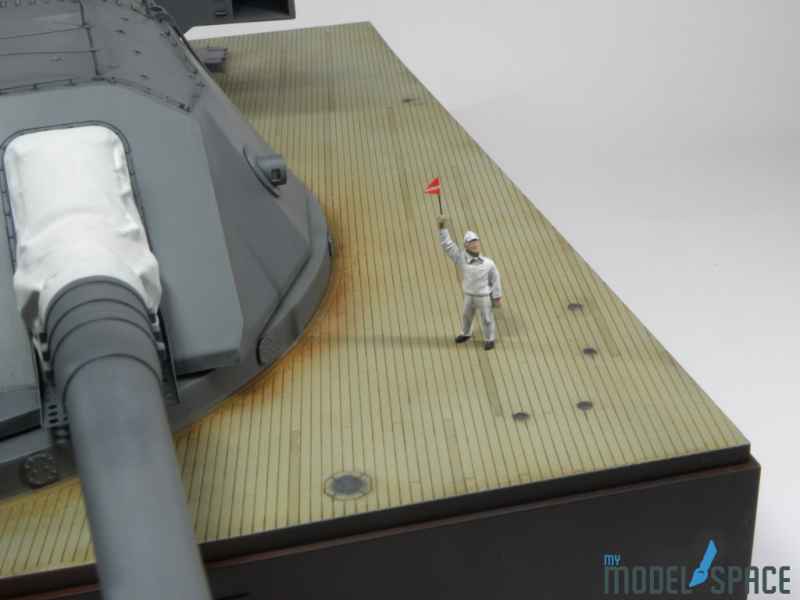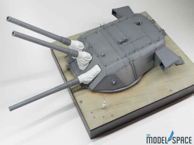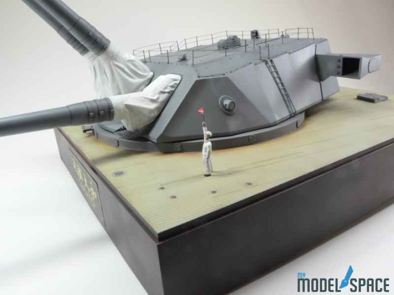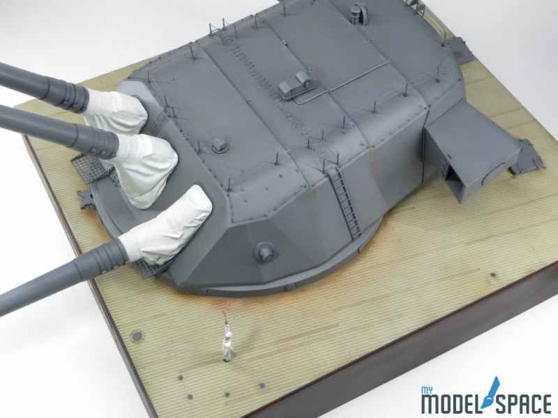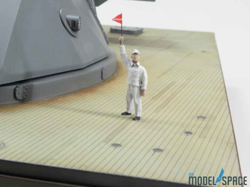 Der Zusammenbau stellt den Modellbauer vor keine allzu grosse Herausforderungen abgesehen davon, dass dieses Teil recht gross ist und somit Platz auf dem Basteltisch wie auch in der Spritzkabine benötigt. Lediglich die Reling auf dem Turm könnte besser sein. Diese wird aus einem Nylonfaden erstellt und der ist doch recht steif. Heute würde ich das komplett aus Draht machen. Die grösste Herausforderung war das finden einer passenden Figur. Ich wollte unbedingt eine Figur neben den Turm stellen damit die Grösse sichtbar ist. Nach langem suchen fand ich dann eine im Sortiment von Hecker & Goros.