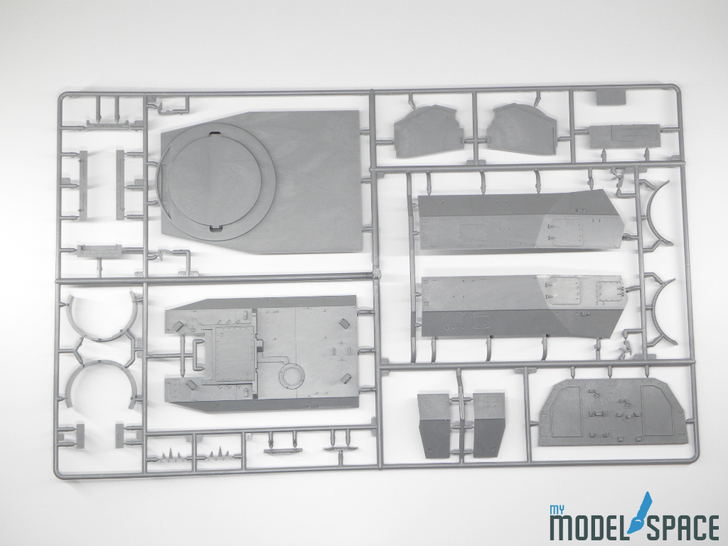Verteilt auf 12 Spritzrahmen aus grauem Plastik. Der Kunststoff ist recht weich und man muss aufpassen das beim versäubern der Teile nicht zuviel Material weg kommt. Das Meterial reagiert dafür sehr gut auf jegliche Art von Plastikkleber.