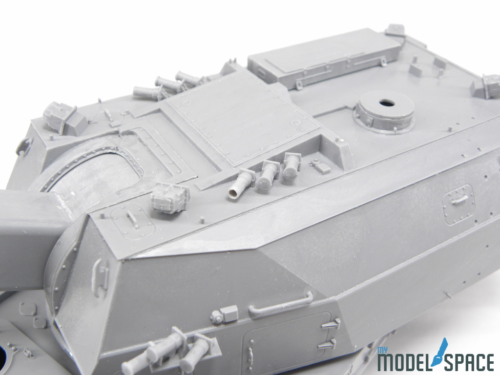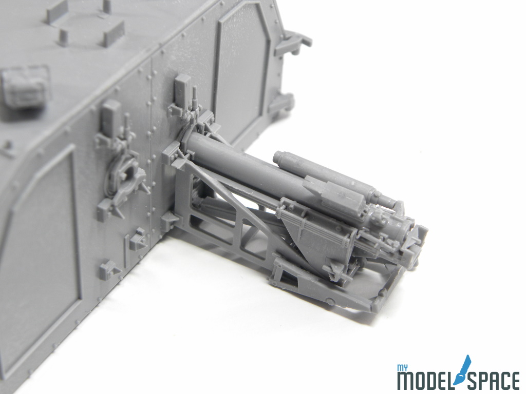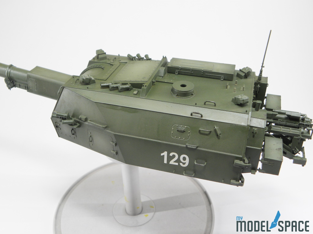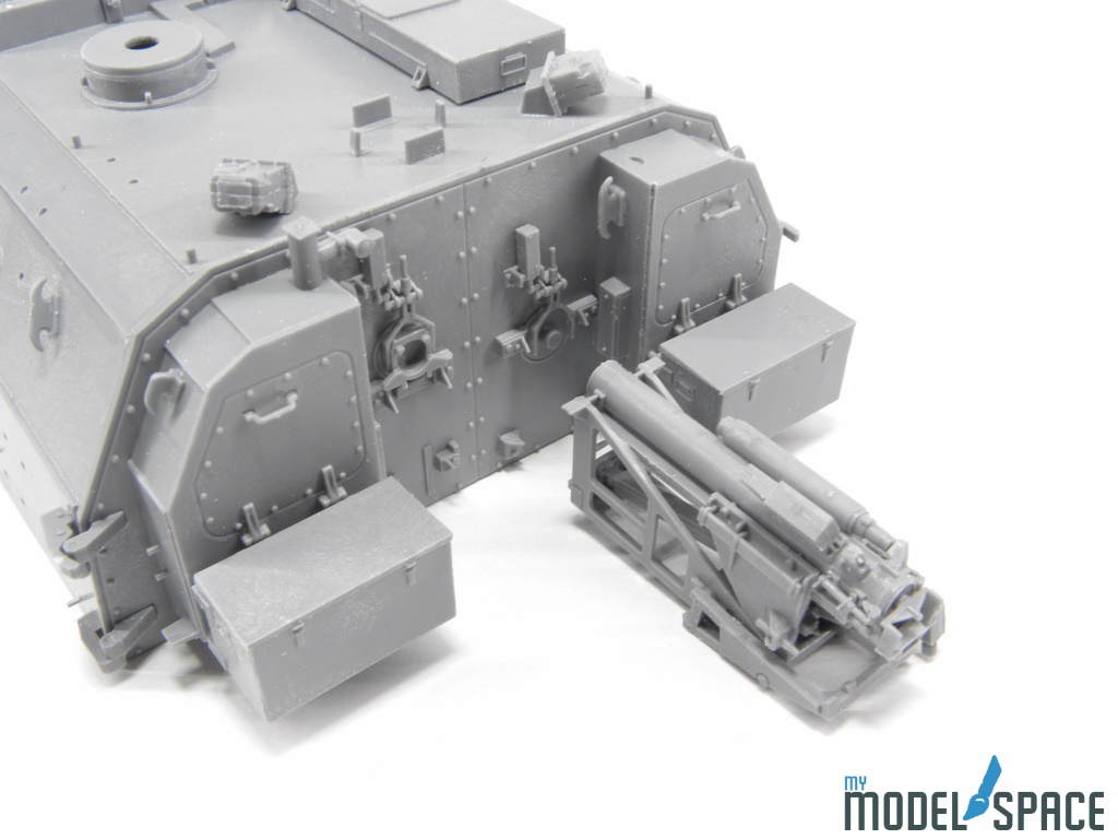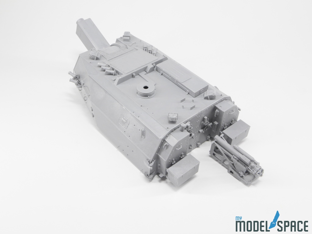 Doch danach zeigt der Bausatz sein wahres Gesicht: Die vielen Anbauteile verlangen Zeit, Konzentration und eine ruhige Hand. Besonders ins Gewicht fällt der Ladeautomat am Heck des Turms. Dieses Bauteil besteht aus zahlreichen kleinen Komponenten, die sauber ausgerichtet und sorgfältig verklebt werden müssen. Hier zahlt sich präzises Arbeiten aus – und auch die Bereitschaft, sich Zeit zu nehmen.