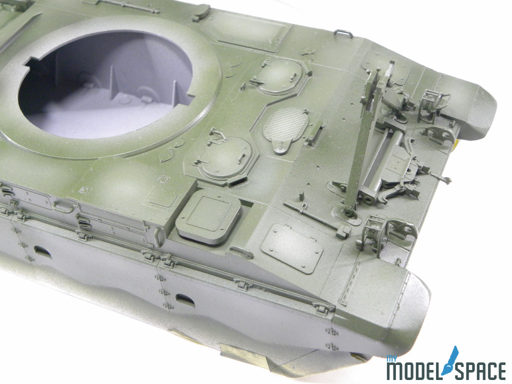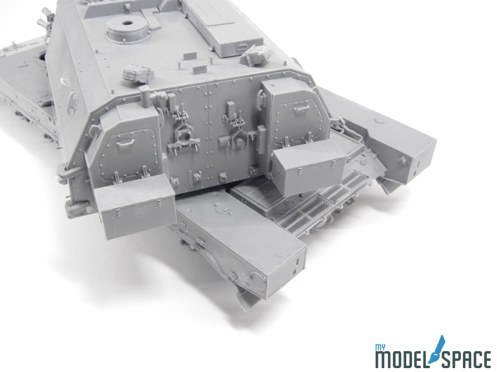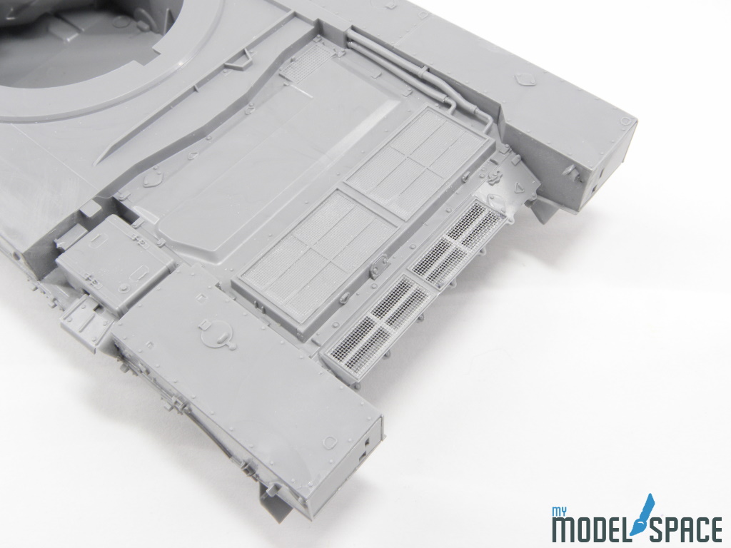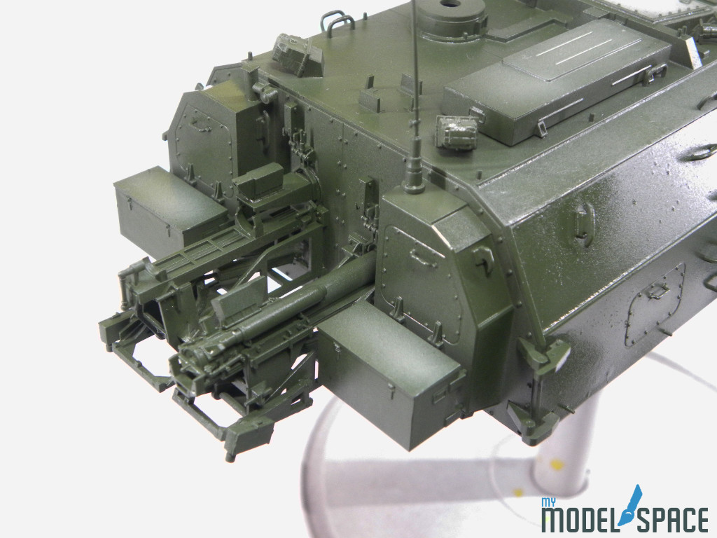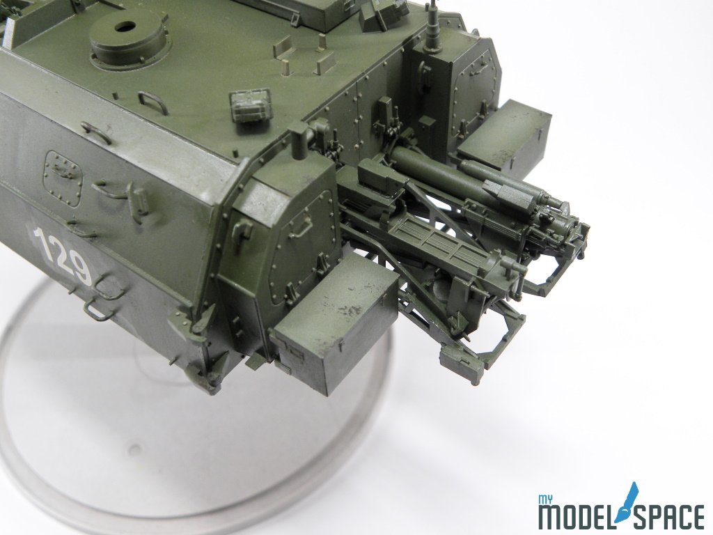 Doch danach zeigt der Bausatz sein wahres Gesicht: Die vielen Anbauteile verlangen Zeit, Konzentration und eine ruhige Hand. Besonders ins Gewicht fällt der Ladeautomat am Heck des Turms. Dieses Bauteil besteht aus zahlreichen kleinen Komponenten, die sauber ausgerichtet und sorgfältig verklebt werden müssen. Hier zahlt sich präzises Arbeiten aus – und auch die Bereitschaft, sich Zeit zu nehmen.