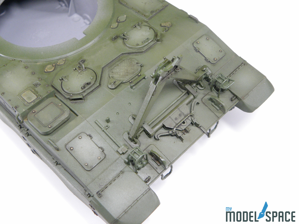 Die 2S35 präsentiert sich im typischen, eher einheitlichen Grün. Damit das Modell aber nicht flach oder langweilig wirkt, habe ich gezielt mit Aufhellungen gearbeitet. Auf verschiedenen Panels wurde die Farbe in der Mitte leicht aufgehellt aufgetragen. Diese Technik bringt Tiefe ins Modell und sorgt dafür, dass die grossen Flächen lebendig wirken.