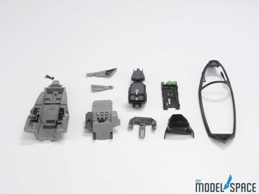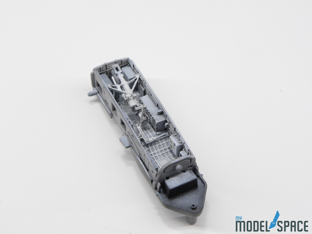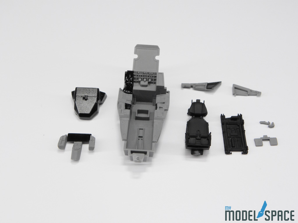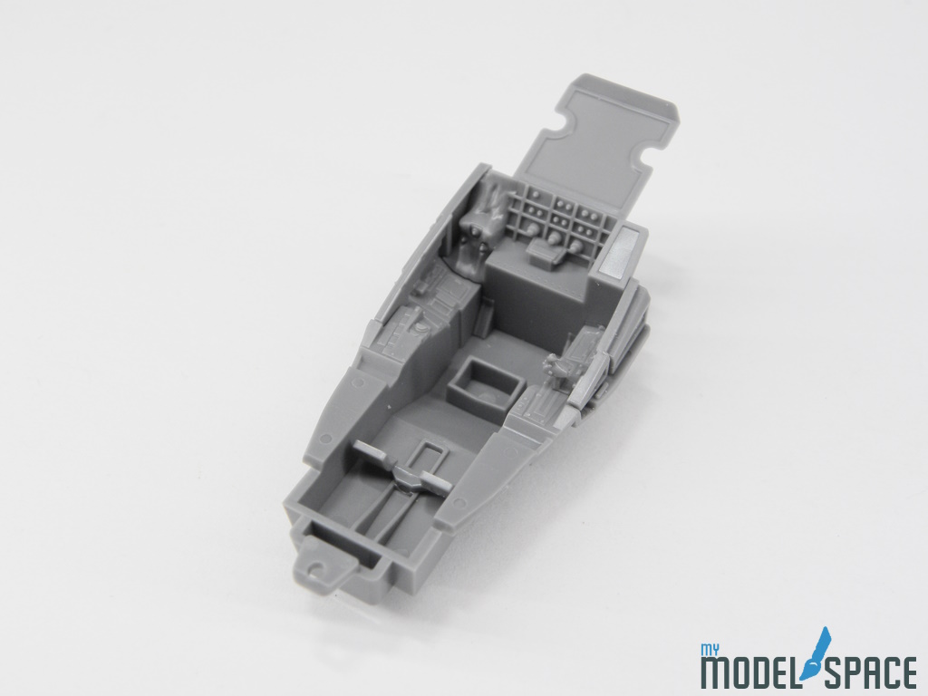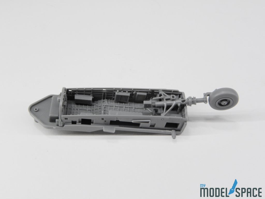 Das schöne bei Tamiya ist, dass sie immer so tolle Farbangaben liefern. Da können sich andere Hersteller eine Scheibe abschneiden. Der Bugfahrwerkschacht ist so konstruiert das man das Fahrwerksbein einklappen kann. Es hält in dieser Position und am Schluss wird ein Pin weggeknipst und das Fahrwerk fährt aus, einfach nur toll. Die erste Stufe des Triebwerks ist ebenfalls wiedergegeben aber sehen wird man davon nix mehr, egal man weiss das sie da ist. Tamiya hat auch diverse Klarsichtteile am Rumpf platziert die dann am Schluss eine Einsicht auf die Sensoren etc. geben. Masken für das abkleben liegen ebenfalls bei.