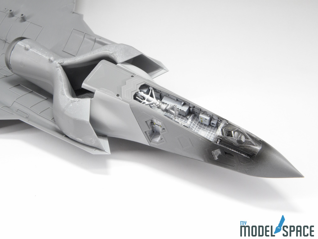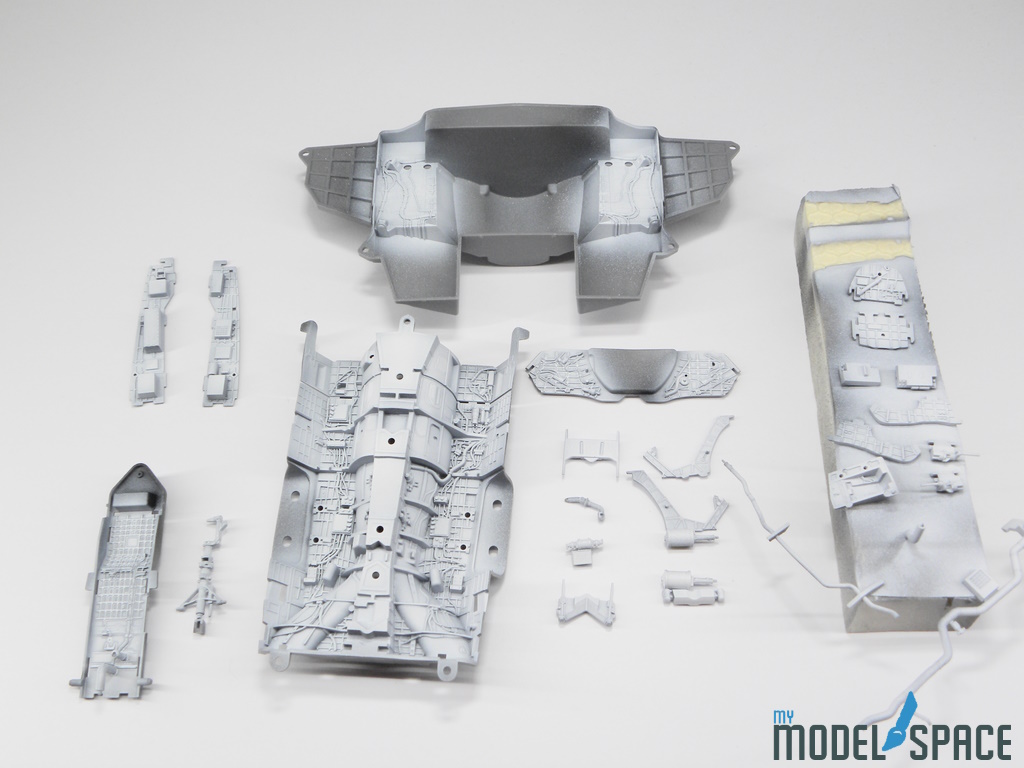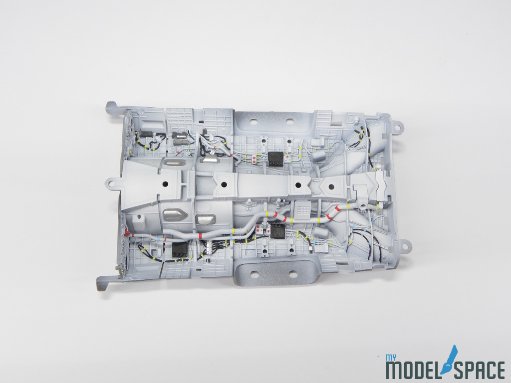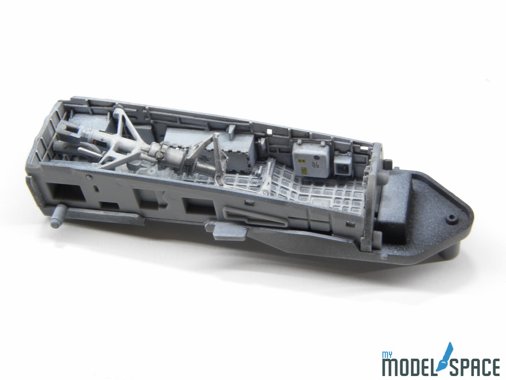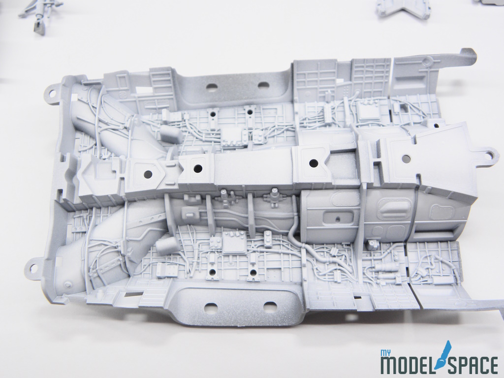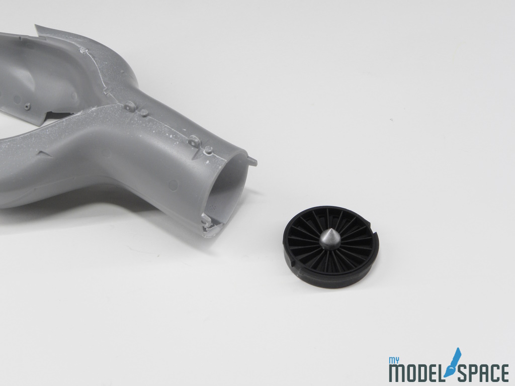 Das schöne bei Tamiya ist, dass sie immer so tolle Farbangaben liefern. Da können sich andere Hersteller eine Scheibe abschneiden. Der Bugfahrwerkschacht ist so konstruiert das man das Fahrwerksbein einklappen kann. Es hält in dieser Position und am Schluss wird ein Pin weggeknipst und das Fahrwerk fährt aus, einfach nur toll. Die erste Stufe des Triebwerks ist ebenfalls wiedergegeben aber sehen wird man davon nix mehr, egal man weiss das sie da ist. Tamiya hat auch diverse Klarsichtteile am Rumpf platziert die dann am Schluss eine Einsicht auf die Sensoren etc. geben. Masken für das abkleben liegen ebenfalls bei.