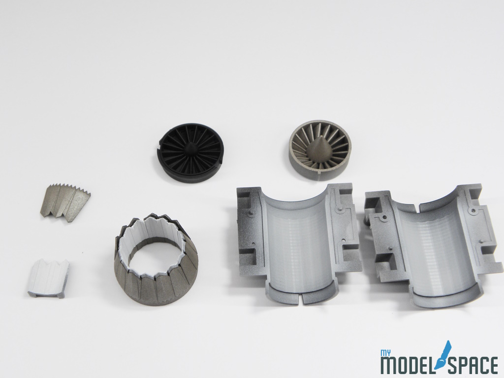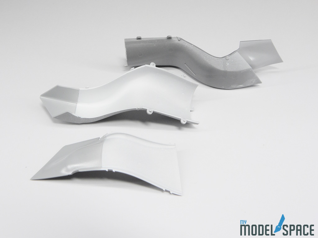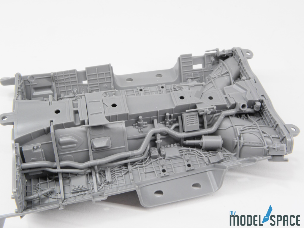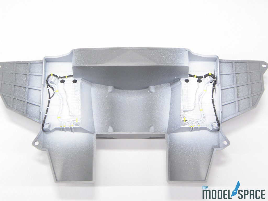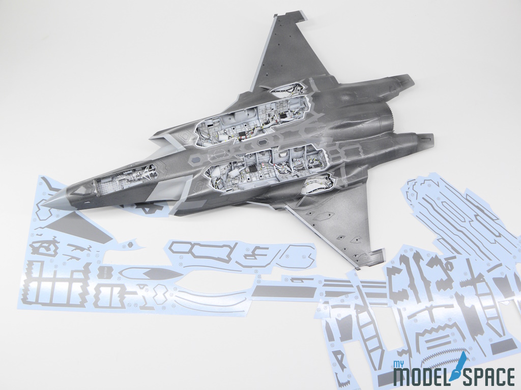 Das schöne bei Tamiya ist, dass sie immer so tolle Farbangaben liefern. Da können sich andere Hersteller eine Scheibe abschneiden. Der Bugfahrwerkschacht ist so konstruiert das man das Fahrwerksbein einklappen kann. Es hält in dieser Position und am Schluss wird ein Pin weggeknipst und das Fahrwerk fährt aus, einfach nur toll. Die erste Stufe des Triebwerks ist ebenfalls wiedergegeben aber sehen wird man davon nix mehr, egal man weiss das sie da ist. Tamiya hat auch diverse Klarsichtteile am Rumpf platziert die dann am Schluss eine Einsicht auf die Sensoren etc. geben. Masken für das abkleben liegen ebenfalls bei.