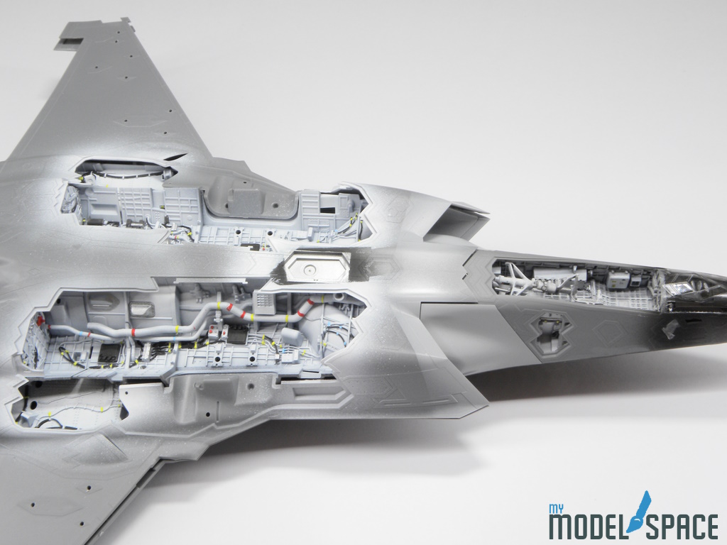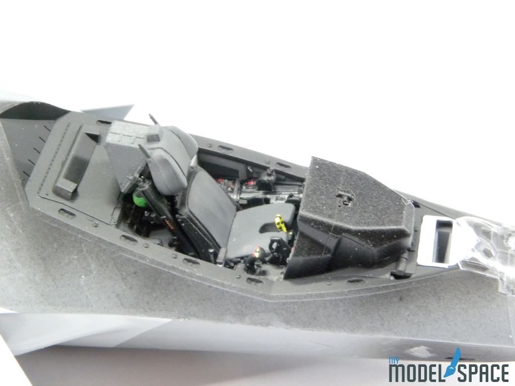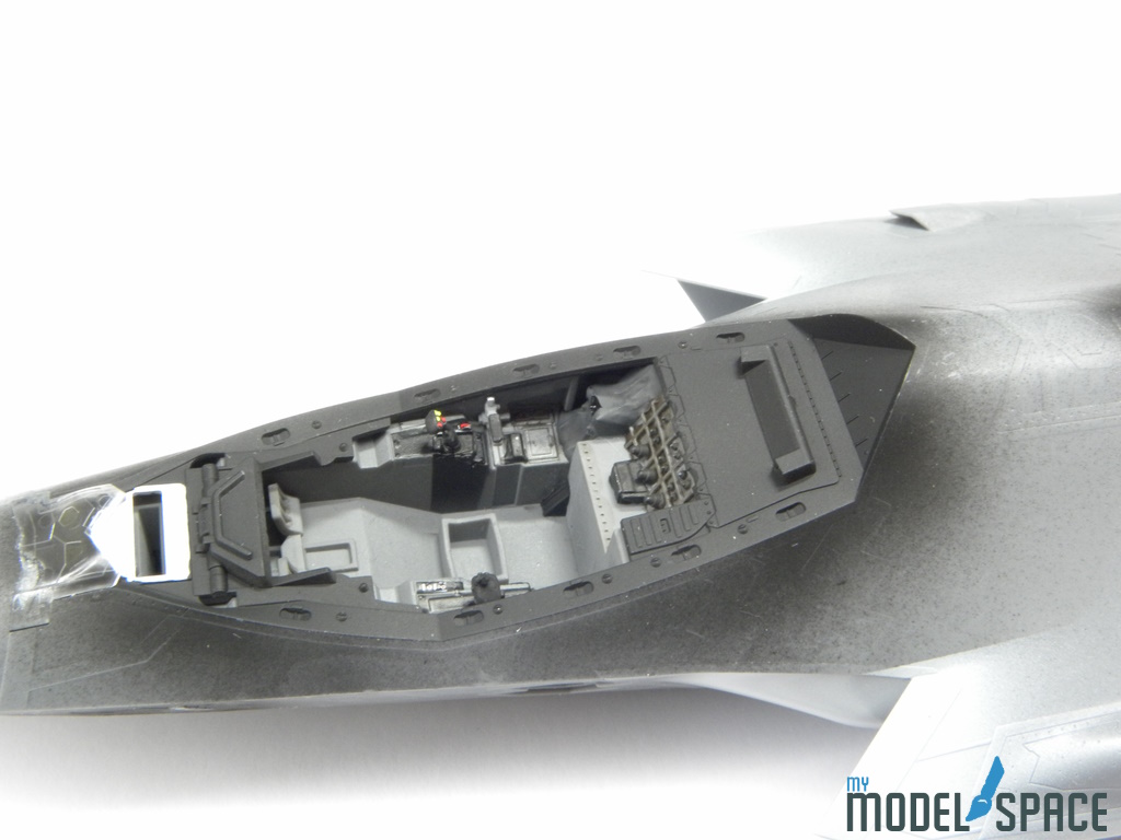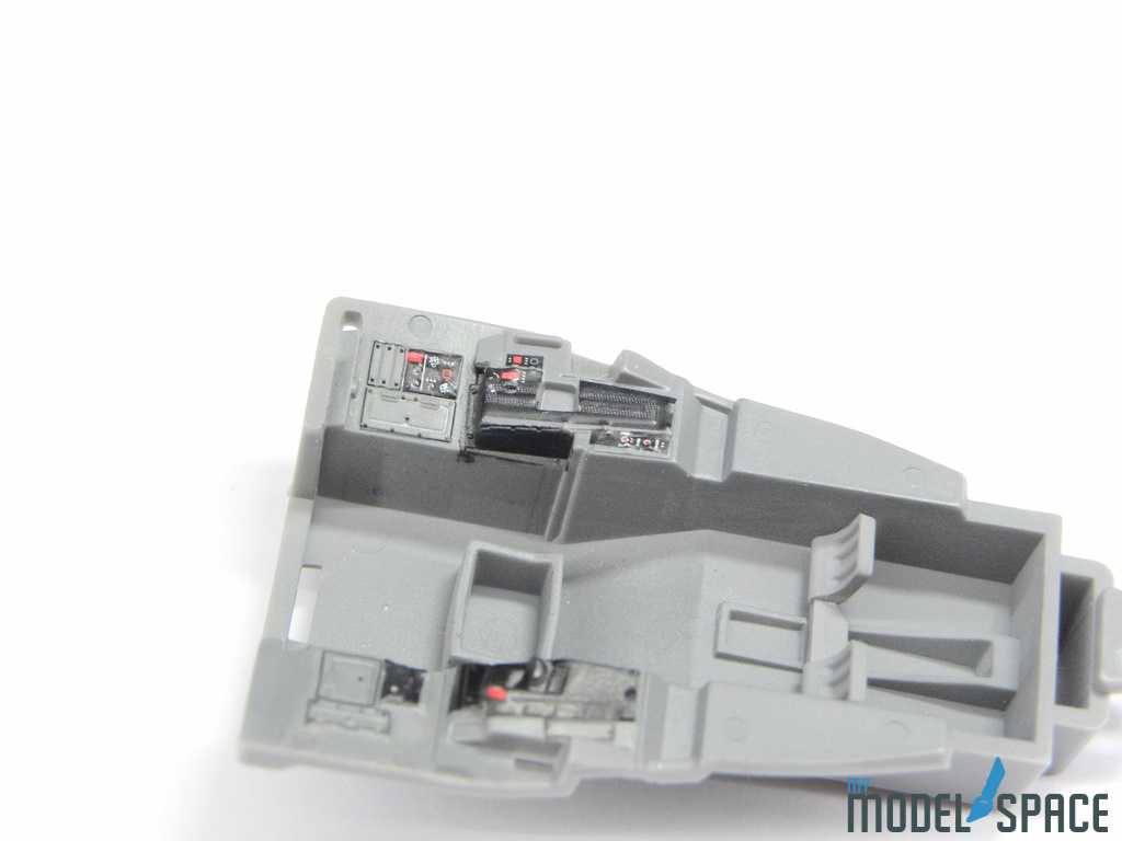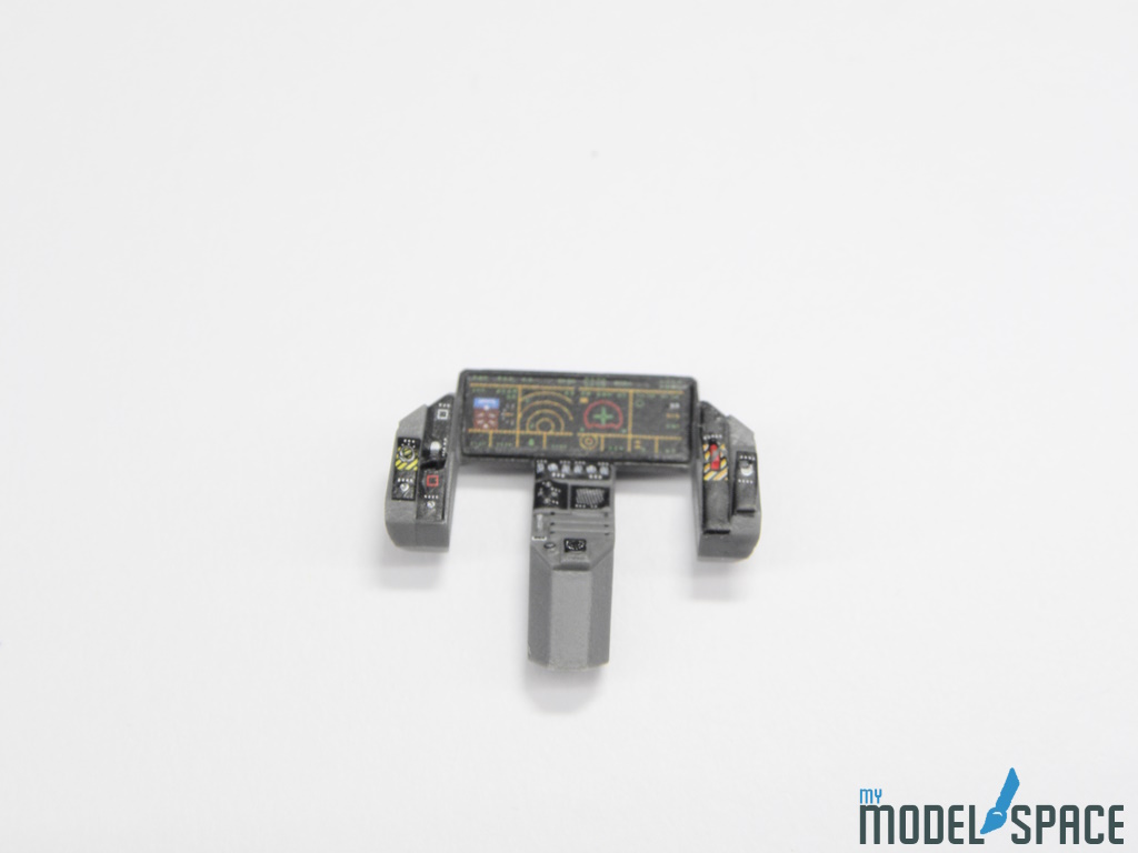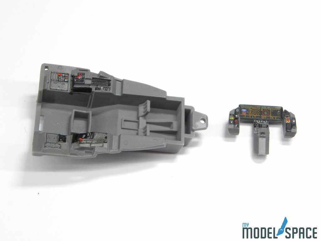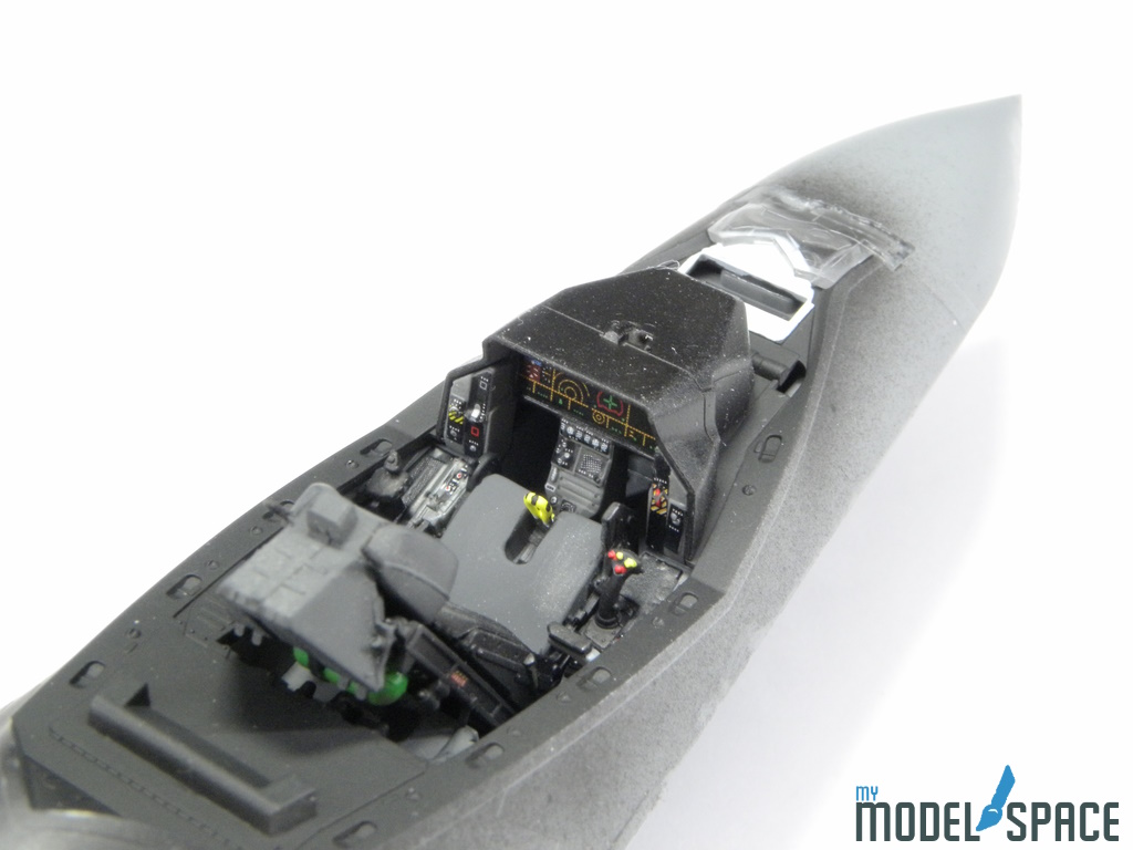 Schon ganz am Anfang muss entschieden werden, welche Version es denn sein darf. Da für mich nur eine frühe Version mit den vielen Ram-Covers in Frage kam, standen von den vielen Varianten nur noch zwei zur Verfügung. USA oder Japan, ich habe mich dann doch für die US Air Force entschieden da dort noch einige Embleme zusätzlich drauf sind. Die Grundlackierung für Cockpit und Waffenschacht, bzw. das Fahrwerk ist rasch abgeschlossen. Ich habe hier das erste mal eine schwarze Grundierung für weiss verwendet. Hört sich komisch an, ergibt aber einen guten Kontrast und sieht nicht so flach aus. Die Detailbemalung des Waffen- und Fahrwerkschachtes hat mich doch fast 3 Stunden gekostet und ist nicht zu unterschätzen.