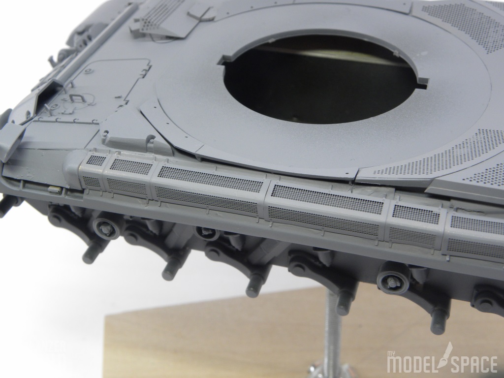 Wie meistens bei Panzern, beginnt der Bau mit der Wanne. Die Wanne von Tamiya ist nicht sonderlich detailliert aber das macht in diesem Fall nichts. Wie bei allen Modellen von mir befestige ich zuerst eine M5 Mutter im Fahrzeug um das Modell beim Bemalen auf eine Gewindestange zu schrauben. Dies erlaubt auch das befestigen auf einem Sockel. Der grösste Fehler des Bausatzes ist der fehlende Abstand zwischen der 3. und 4. Laufrolle. Ich bin mir aber noch nicht sicher ob ich dies korrigieren soll. Die zwei grossen Staukästen am Heck sind ebenfalls nur an den 15 Vorserienfahrzeugen zu finden. Da ich aber ein frühes Fahrzeug bauen will, werde ich das so belassen.